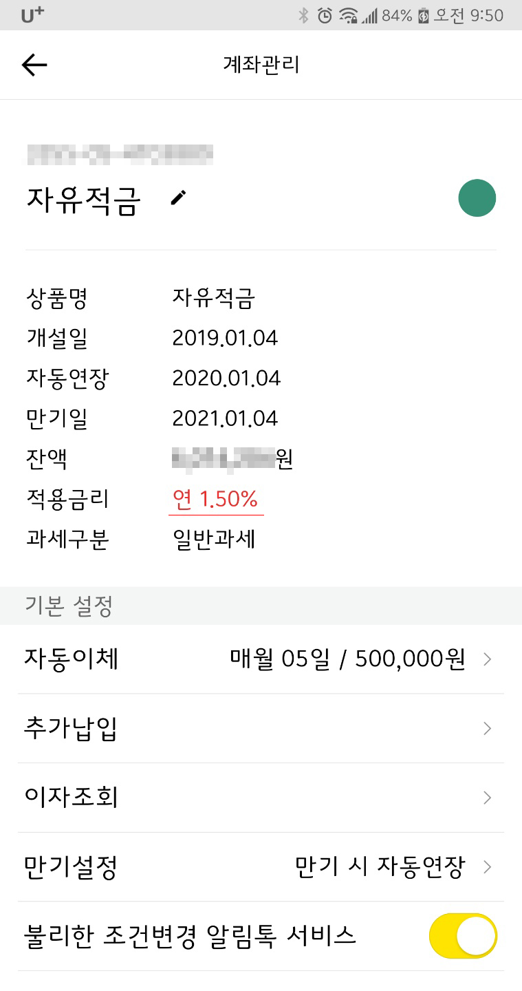 1년 정기적금 만기 후 자동연장 되었는데 기존 2.7%보다 훨씬 적은 1.5% 이자율로 대폭 떨어졌더라고요.