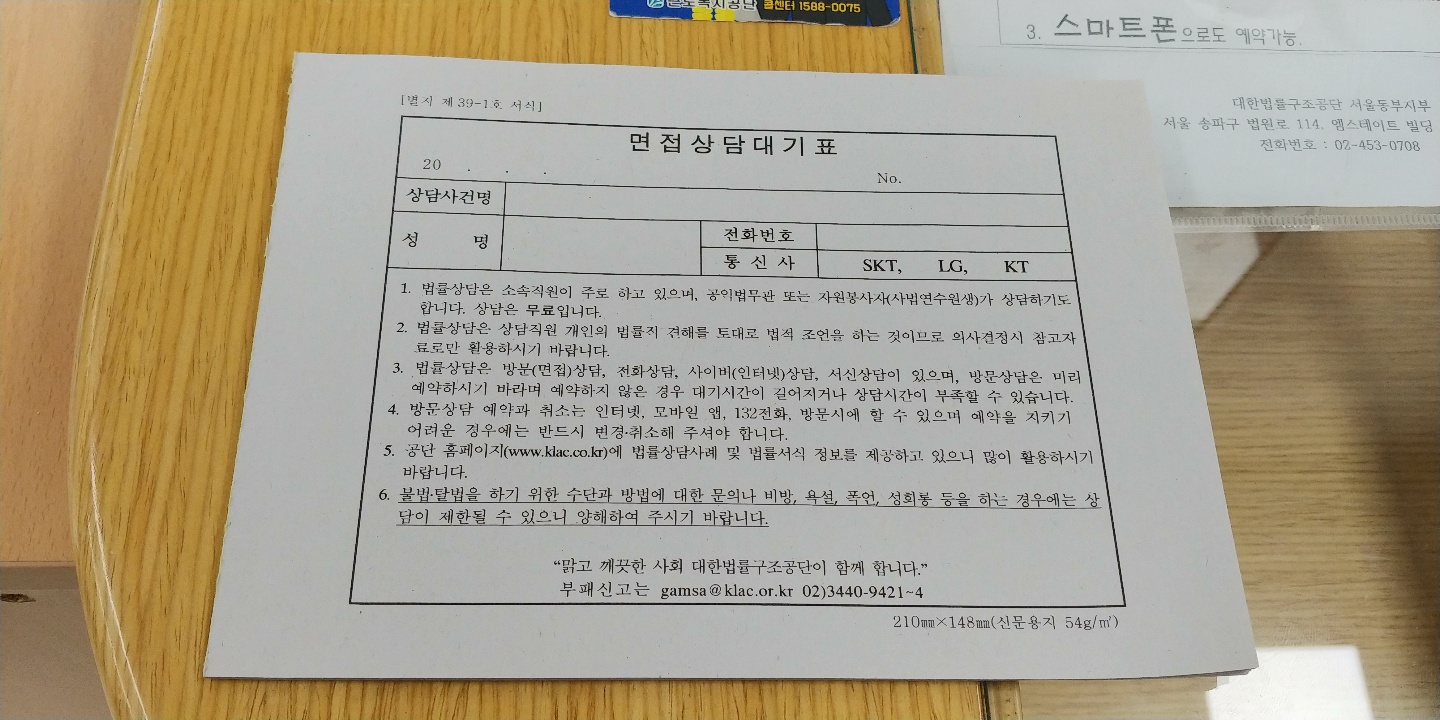 따로 접수를 도와주는 분은 없으며 번호표를 뽑고 면접상담대기표에 간단한 상담내용과 이름, 전화번호를 적고 대기합니다.